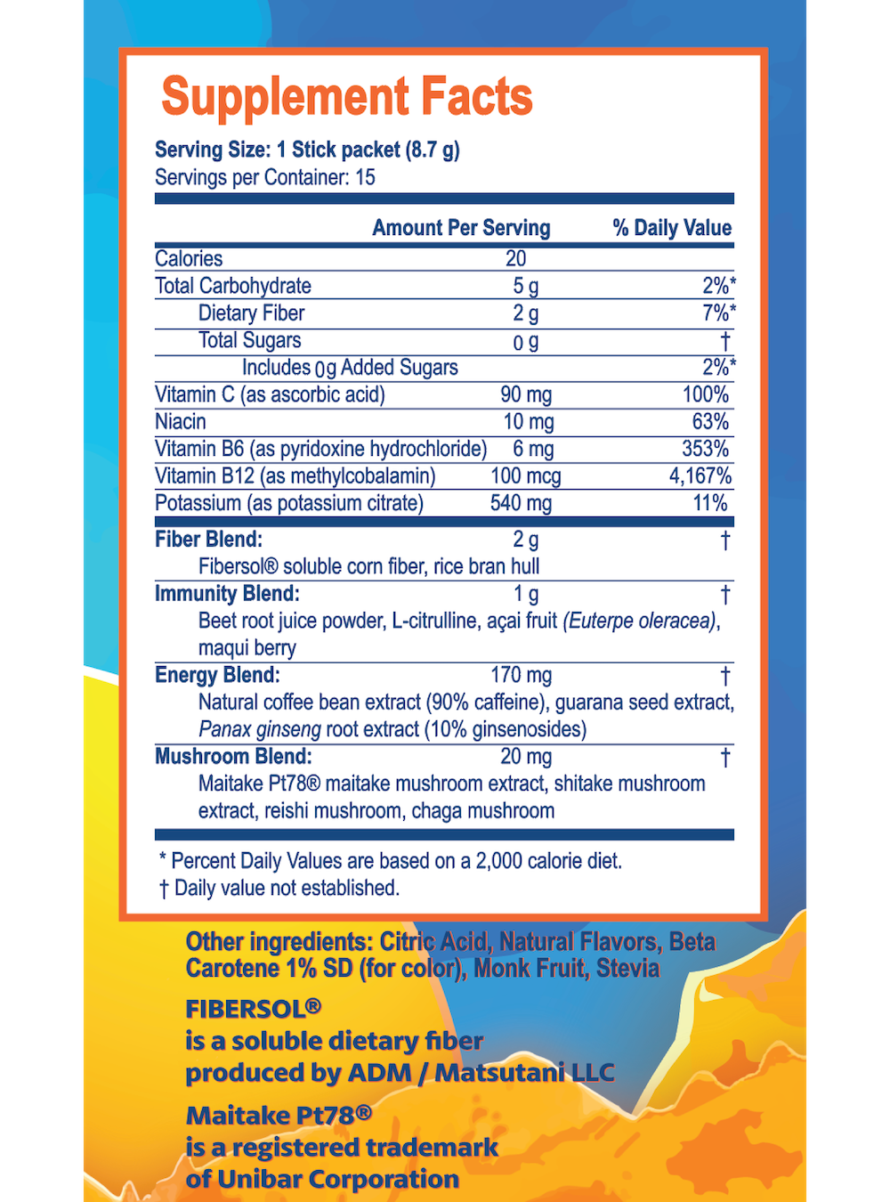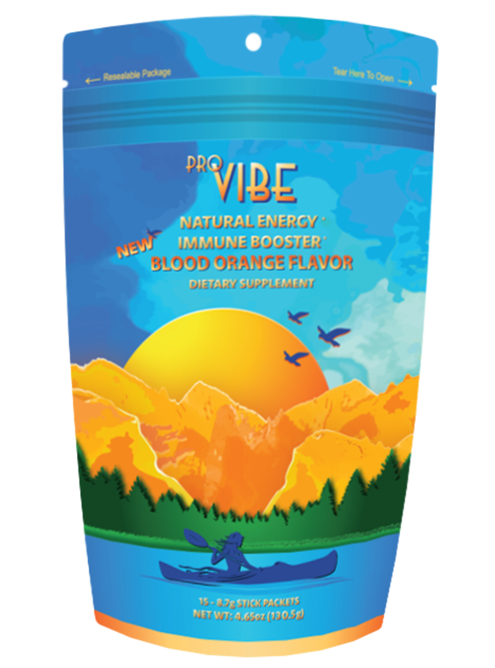 Our great tasting, natural energy and immune boosting powdered drink mix is just the thing you’ll be craving any time you feel the need for a pick me up. Easy pour packets are perfect for at home or on the go… Just add water and Feel the Vibe!